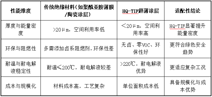 HQ-TIF技術的價值定位與未來展望HQ-TIF超薄阻燃絕緣涂層技術,憑借其“超薄化、高性能化、綠色安全化”的三重優勢,成功突破了傳統絕緣材料在厚度、環保、阻燃、電性能等方面的瓶頸。其綜合性能高度契合新能源電池對高能量密度、高安全性和長壽命的核心需求。未來,隨著HQ-TIF在長期可靠性驗證、工藝適配性優化和成本控制方面的持續突破,有望成為新能源電池絕緣材料的主流解決方案,為動力電池與儲能電池的技術升級提供強力支撐。HQ-TIF不僅是一次材料性能的躍升,更是一條從“功能滿足”走向“性能躍升”的關鍵創新路徑。