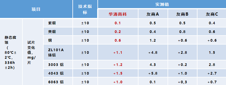 針對標(biāo)準(zhǔn)試片及OEM客戶實(shí)際試片對HQ-EV100新能源電動汽車專用冷卻液開展靜態(tài)腐蝕和循環(huán)臺架腐蝕試驗(yàn),試驗(yàn)后金屬試片變化值均控制在5mg/試片以內(nèi),遠(yuǎn)低于GB 29743.2要求的10mg/試片限值,其中多種鋁合金的質(zhì)量變化量遠(yuǎn)低于國標(biāo)上限值。產(chǎn)品不含亞硝酸鹽、硼酸鹽等成分,從源頭守護(hù)電池安全。