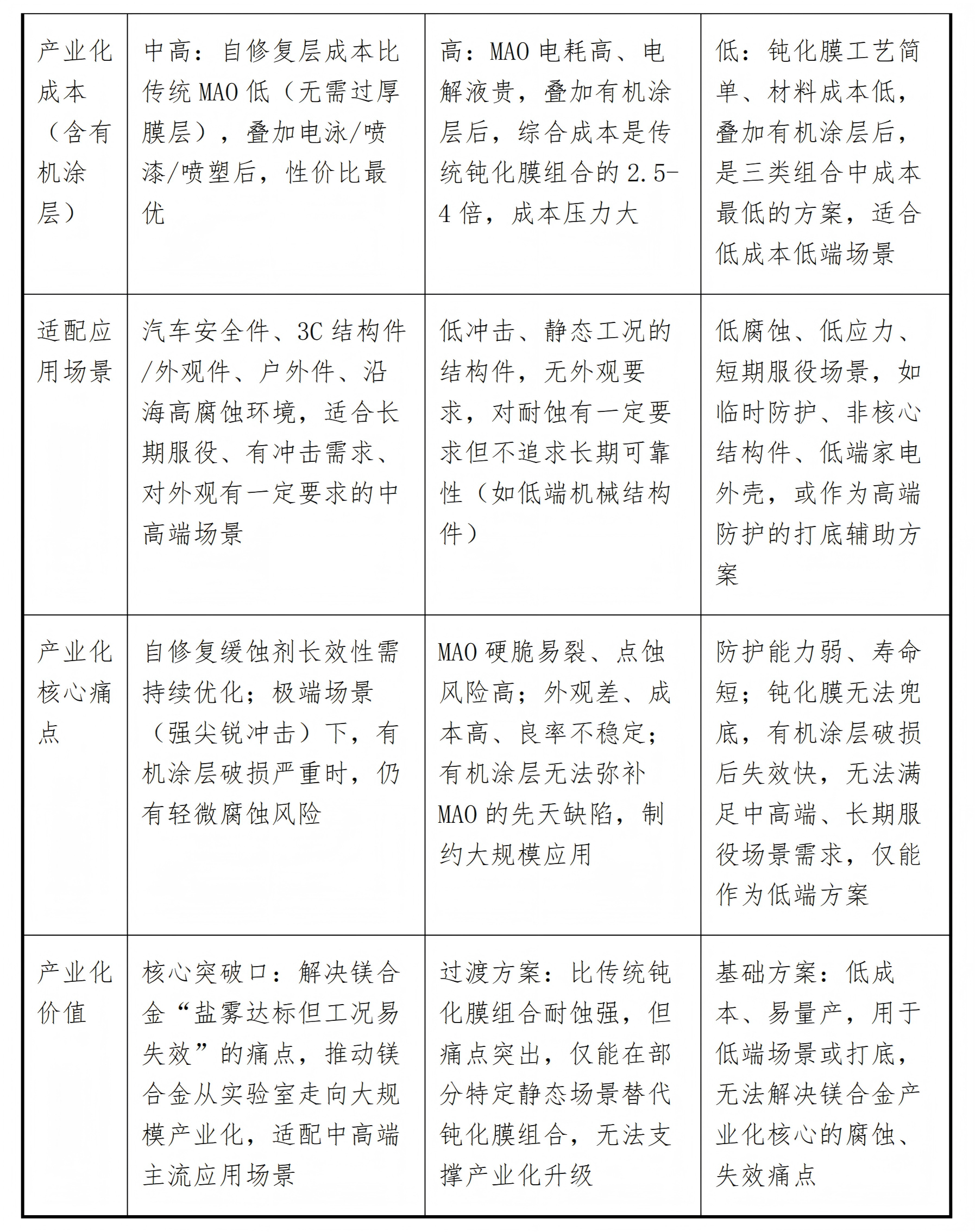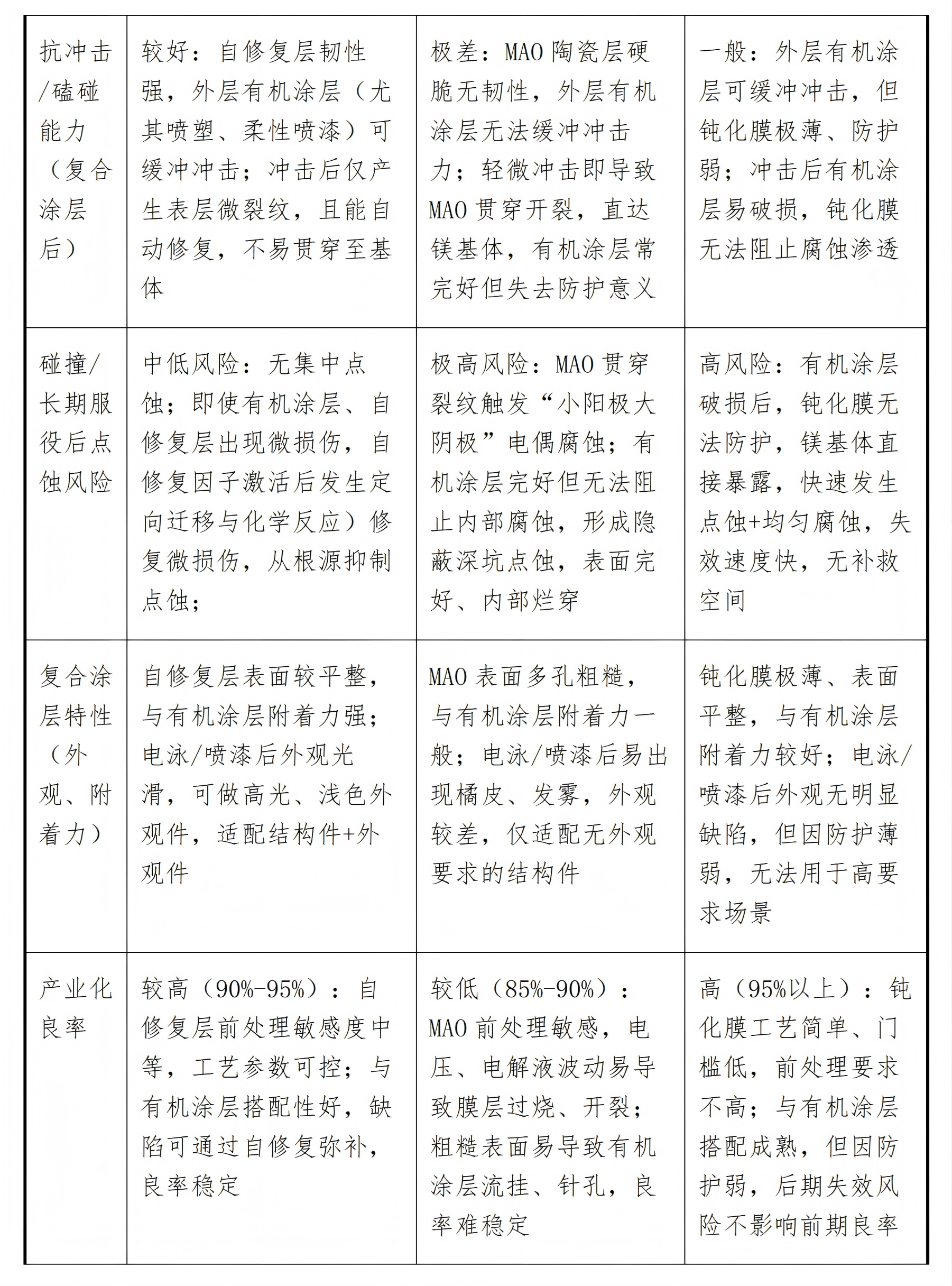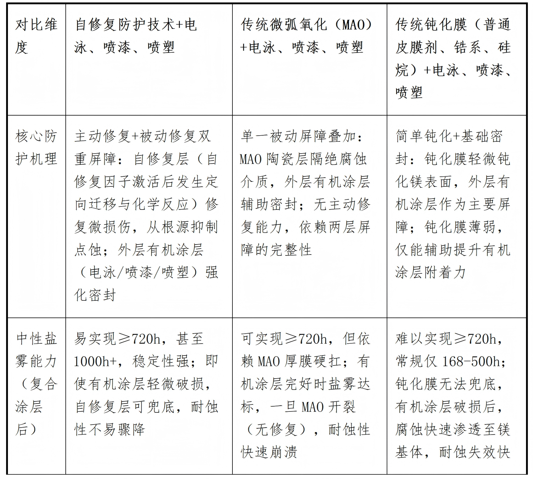 核心結論:三類防護技術與電泳、噴漆、噴塑搭配后,均構成鎂合金復合防護體系,但防護可靠性、產業化適配性、失效風險差異顯著——傳統鈍化膜+有機涂層(電泳/噴漆/噴塑)門檻低但耐蝕弱,傳統MAO+有機涂層耐蝕達標但易隱蔽失效,自修復防護技術+有機涂層是唯一能突破鎂合金產業化腐蝕痛點、兼顧耐蝕與可靠性的核心組合方案。以下從產業化關鍵維度,對三類組合方案做精準對比,全為工程化干貨,可直接用于報告、選型參考。