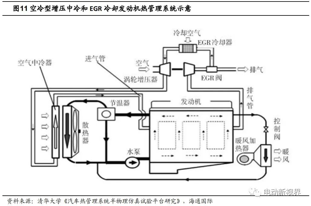 傳統內燃機還有兩項專有的重要技術,增壓、EGR(廢氣再循環)。渦輪增壓系統利用發動機排氣動能壓縮進氣,提高充氣效率,有益于混合氣的形成以及缸內燃燒;而廢氣再循環系統通過將部分廢氣返回到發動機氣缸再次燃燒,主要是為了減少尾氣中氮氧化物含量。但這兩項技術分別需要對于熱管理的需求都很高,所以傳統內燃機架構中必不可少的就是中冷器和 EGR 冷卻器。