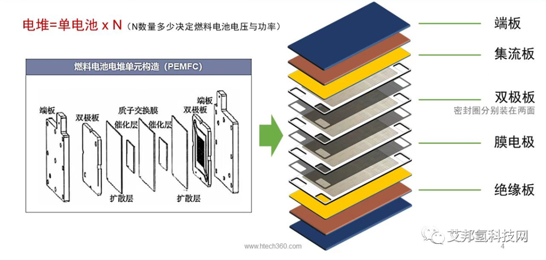 燃料電池電堆是燃料電池發(fā)電系統(tǒng)的核心,由多個(gè)單體電池以串聯(lián)方式層疊組合構(gòu)成。將雙極板與膜電極交替疊合,各單體之間嵌入密封件,經(jīng)前、后端板壓緊后用螺桿緊固拴牢,即構(gòu)成燃料電池電堆。