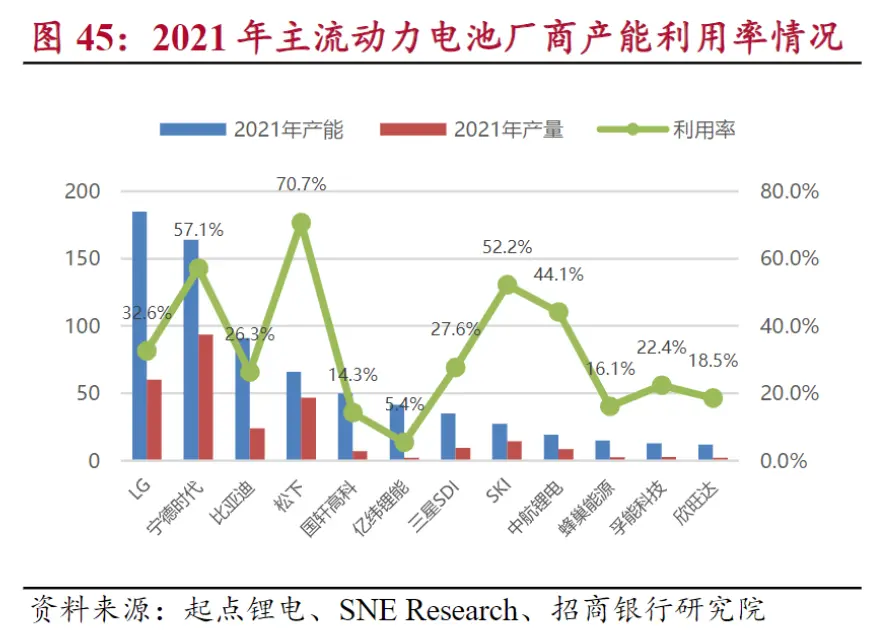 但從產能利用率數據來看,二線廠商顯著低于頭部廠商,其中中航鋰電(44.1\%)處于前列,孚能科技(22.4\%)、欣旺達(18.5\%)、蜂巢能源(16.1\%)、國軒高科(14.3\%)、億緯鋰能(5.4\%)則遜色不少。