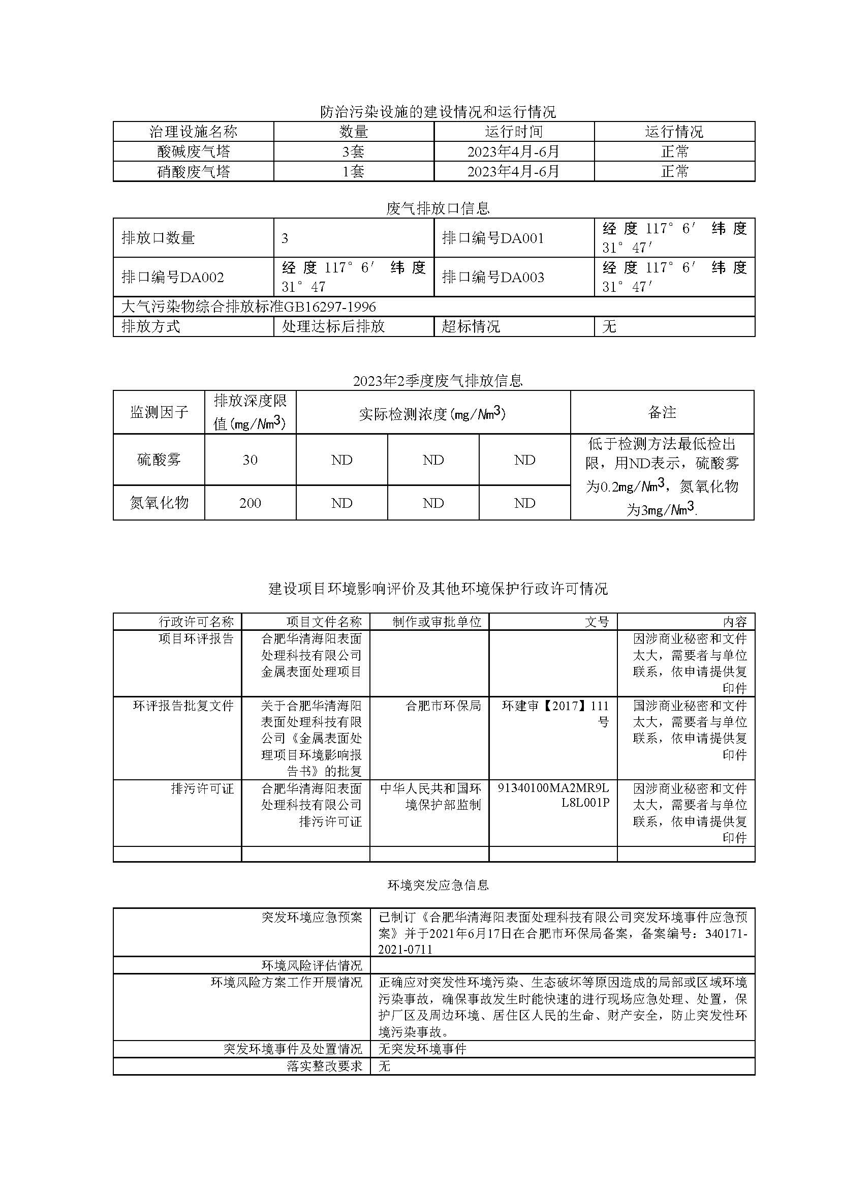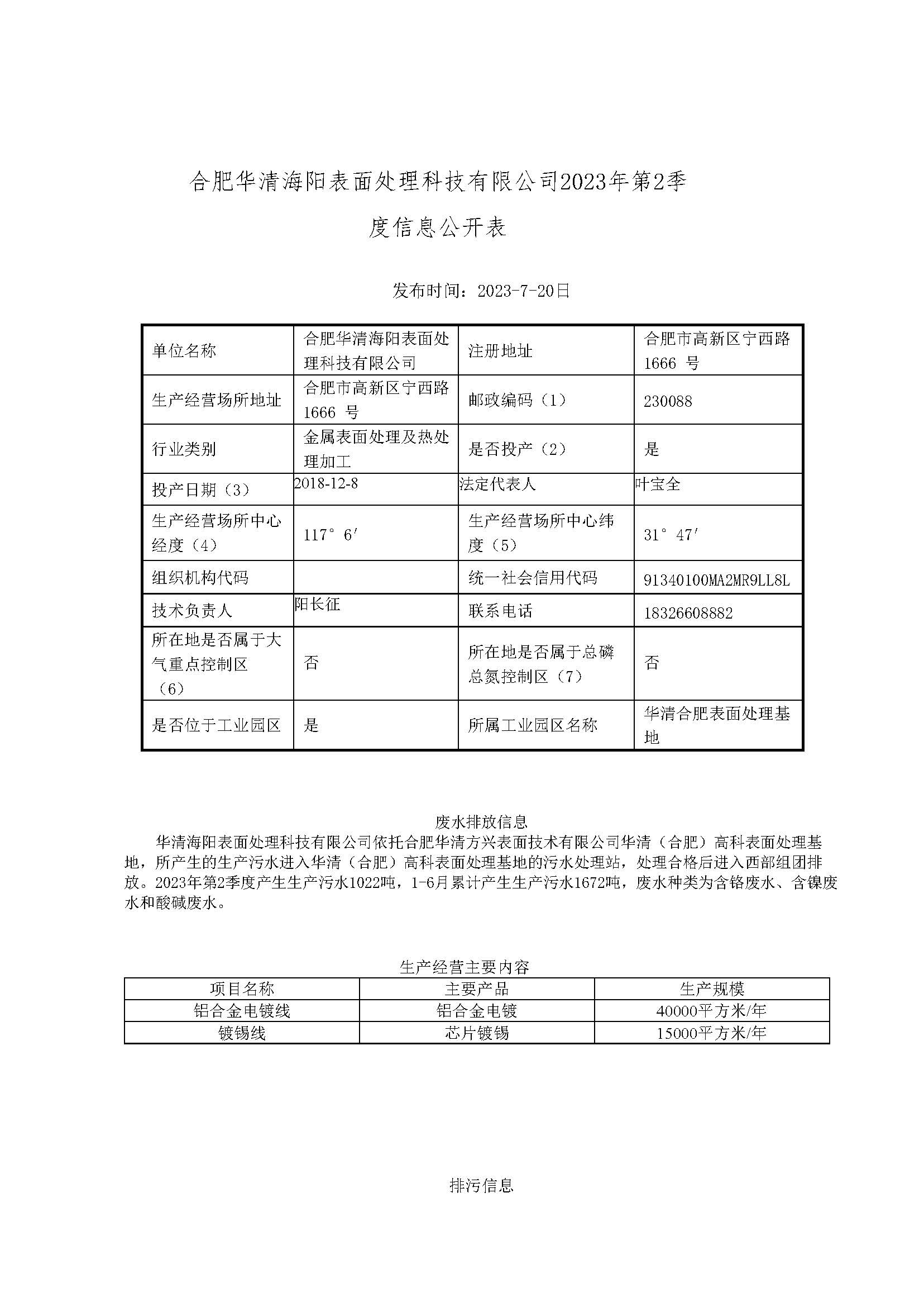 合肥華清海陽表面處理科技有限公司2023年第2季度信息公開表