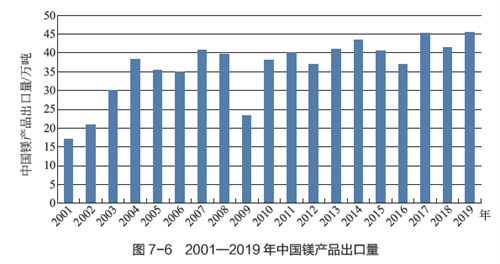根據(jù)中國有色金屬工業(yè)協(xié)會(huì)的統(tǒng)計(jì)數(shù)據(jù)顯示,2019年我國的原鎂產(chǎn)量為96.9萬噸,較去年增長了12.2%。目前,全球約有45%的原鎂用于生產(chǎn)鎂合金,其中70%用于汽車行業(yè),20%用于3C電子產(chǎn)品,而10%則應(yīng)用于軍工等領(lǐng)域。如圖7-6所示,2019年我國出口的原鎂和鎂制品數(shù)量達(dá)到了45.16萬噸,占全球總產(chǎn)量的53%。在鎂合金的深加工產(chǎn)品中,壓鑄方式仍然占主導(dǎo)地位,但存在一定的局限性,制約了鎂合金應(yīng)用的大規(guī)模擴(kuò)展。因此,進(jìn)一步攻關(guān)變形鎂合金產(chǎn)品的加工技術(shù)和應(yīng)用技術(shù)顯得尤為重要。