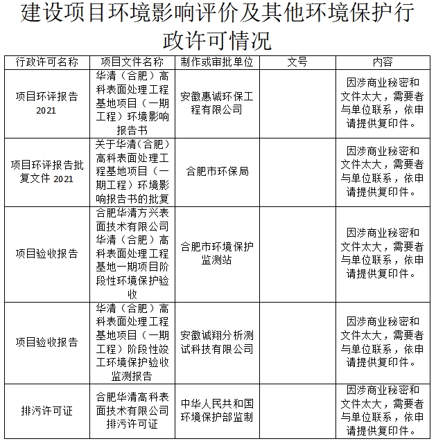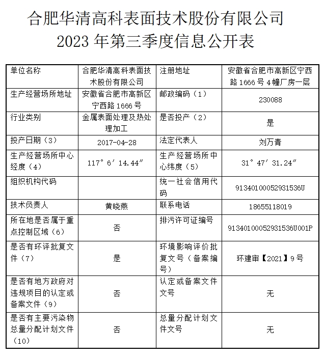 合肥華清高科表面技術股份有限公司 2023年第三季度信息公開表