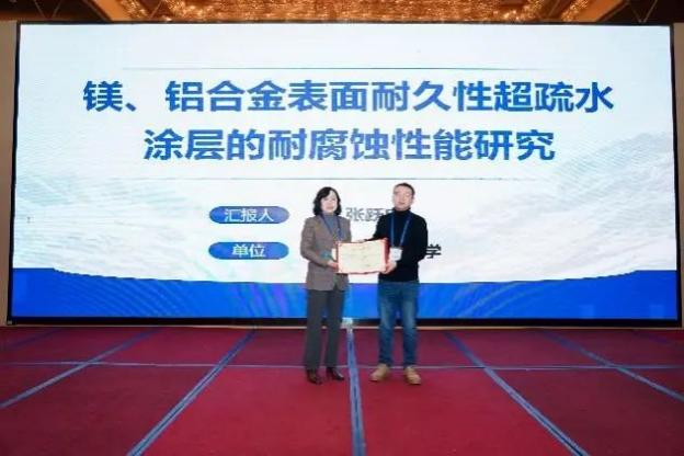 太原科技大學張躍忠副教授作了題為《鎂、鋁合金表面耐久性超疏水涂層的耐腐蝕性能研究》的報告
