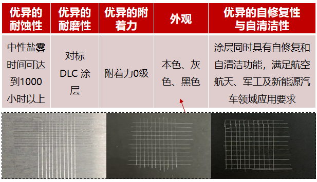 克服了現有的微弧氧化技術瓶頸,中性鹽霧可達1000小時以上,具有優異的耐蝕性、附著力,不受復雜形狀工件的限制、工藝時間短、顏色可控等優點,滿足航空航天、軍工、3C、5G通信、新能源汽車等行業的耐蝕性、耐磨性的需求,與現有的微弧氧化技術相比,大幅度降低了成本,為鎂合金產化應用提供了有力的支撐,產業化應用市場巨大。